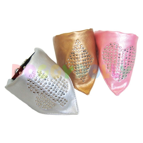 Das goldene Halstuch aus Kunstleder von Doggydolly Hundemode ist eine schöne Alternative zu herkömmlichen Halsbändern. Das Hundehalstuch besteht aus einem dreieckigen Tuch, durch das ein Kunstlederhalsband gezogen ist. Das Halsband wird am Nacken mit einer Schnalle verschlossen. Die Leine kann am D-Ring befestigt werden. Das Hundeaccessoire ist mit silbernen Nieten besetzt.