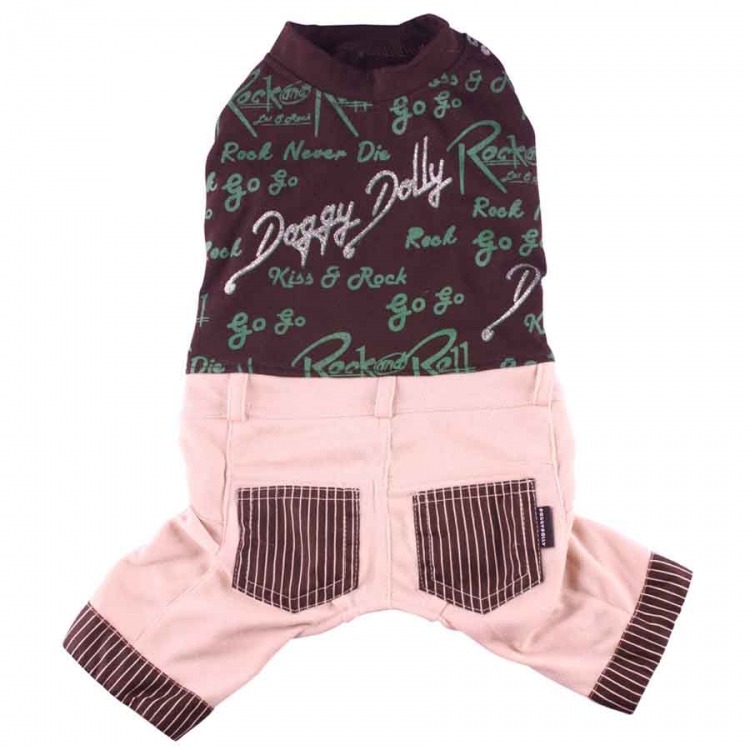 Hundekombi mit beiger Stoffhose und schwarzem Tanktop von Doggydolly Hundemode. Dieses Hundekombi ist genau das Richtige für die Rock'n'Roll-Fans unter den Rüden. Die Stoffhose trägt aufgesetzte Taschen aus braun-beige gestreiftem Stoff. Der untere Saum ist ebenfalls braun-beige gestreift. Das schwarze Tanktop trägt verschiedene kleine Schriftzüge in grün und grau. Dieses Modell ist auch für die Hundedame mit Lagenrock erhältlich.