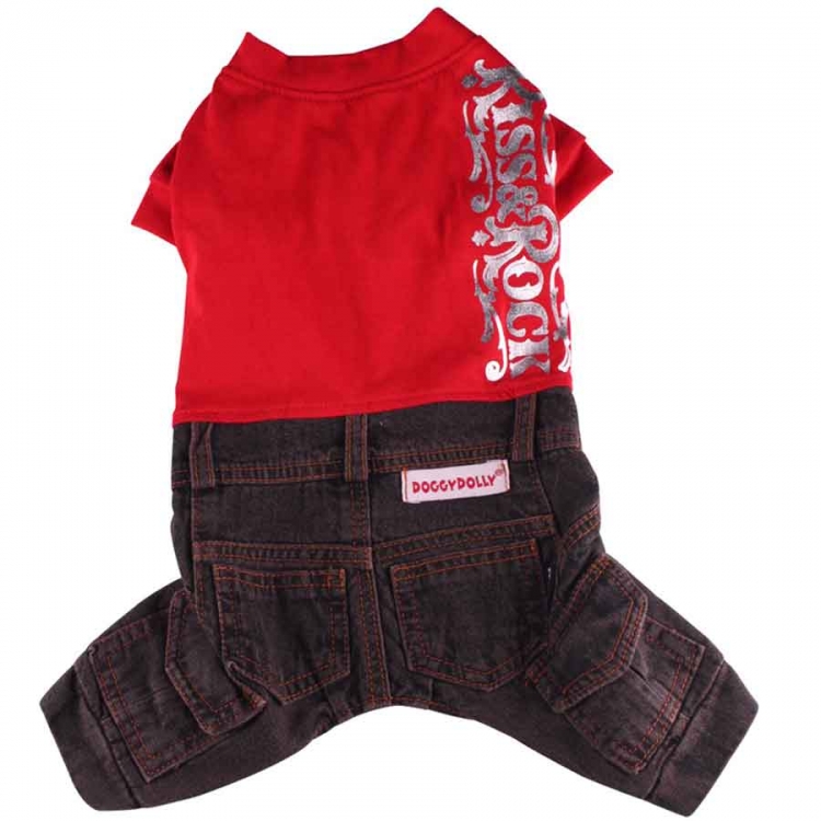 Diese Kombination von Doggydolly Hundebekleidung aus Hundehose und T-Shirt ist sowohl schick als auch frech und rockig. Die Hundekombi besteht aus einer Jeanshose mit aufgesetzten Leckerli-Taschen und einem roten Hundeshirt. Die Hose ist aus weichem stone-washed Denim und deswegen angenehm zu tragen. Auf dem Shirt steht in silber die Aufschrift Kiss & Rock in Tribaloptik. Dieses Modell ist ebenfalls als Hundekleid mit Jeansrock erhältlich.