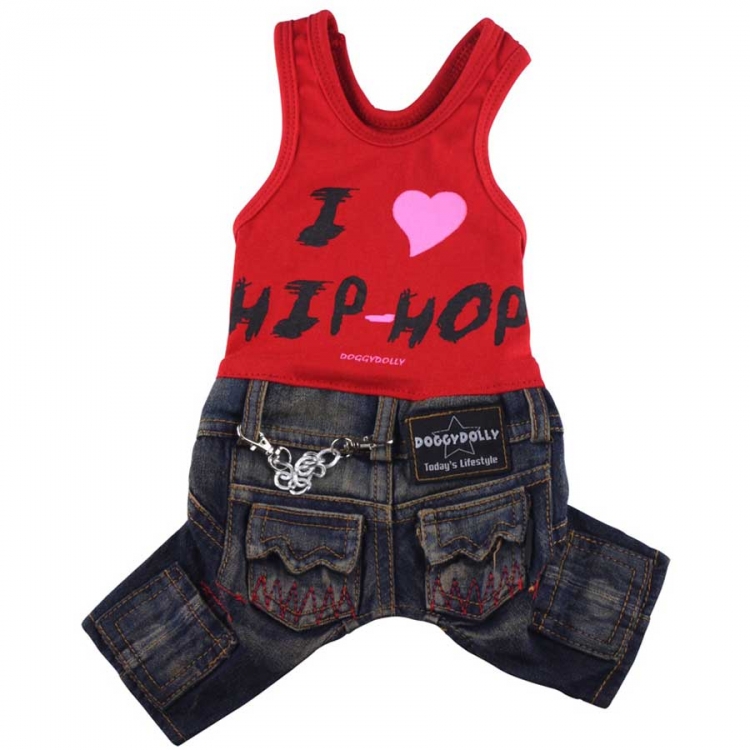 Diese Jeanskombi von Doggydolly Hundebekleidung mit rotem Tanktop verleiht Ihrem kleinen Racker einen coolen Look. Auf dem Oberteil befindet sich ein großer I love Hip Hop Aufdruck und die Hose ist mit kleinen Details wie Hosentäschchen verziert. Damit kann sich Ihr kleiner Liebling auf jeder Party sehen lassen. Das Hundeshirt ist ärmellos, auf der Jeans ist ein Deko-Kettchen aus Metall angebracht.