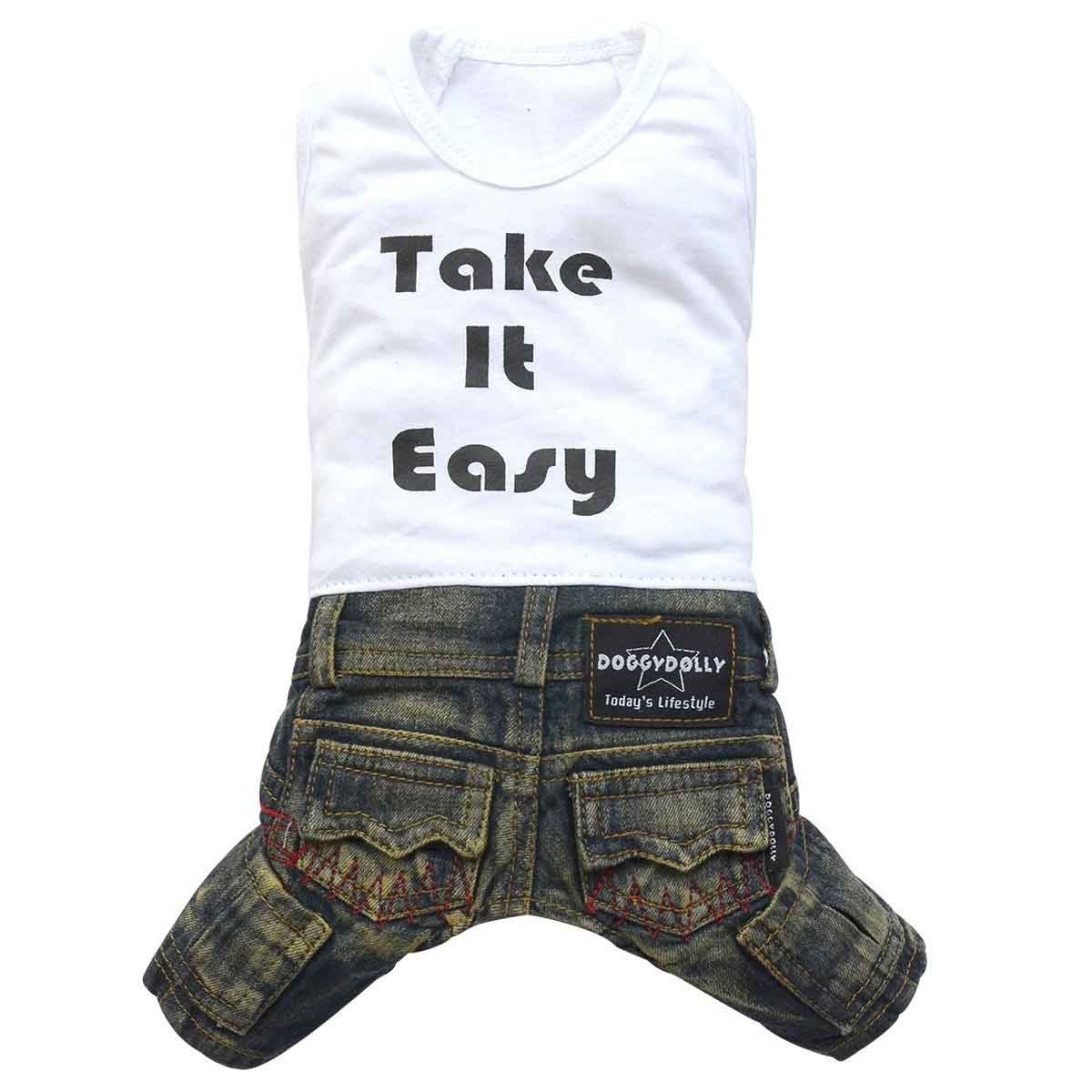 Die sportliche Hunde-Jeanskombi aus der DoggyDolly Kollektion ist ideal als Outfit für den Frühling oder Sommer. Der Hundeanzug besteht aus einer Jeanshose und einem Hundeshirt in einem Kleidungsstück. Die Hundehose ist aus echtem Denim-Stoff, stonewashed, im black-used-Style, mit den typischen Jeansnähten und anderen liebevollen Details, wie Taschen u.s.w. Das ärmellose Hunde-T-Shirt ist weiss und hat einen Aufdruck auf der Rückenpartie: TAKE IT EASY. Durch das weiche Material ist die Jeanskombi für den Hund angenehm zu tragen und engt ihn in seiner Bewegungsfreiheit nicht ein. Die Intimzonen sind freigehalten, so dass der Hund sich lösen kann. Waschbar bei 30°C Feinwäsche. Größe XL Brust 51-53cm, Rücken 33-35cm