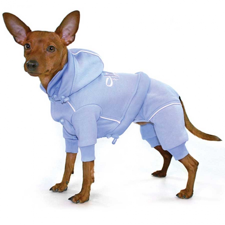 Der 4Pfoten Jogginganzug für Hunde ist ideal für empfindliche Hunde. Als leichter Kälteschutz im Haus oder als Sonnenschutz für Hunde mit wenig Fell, wie zum Beispiel Nackthunde ist der Hundeoverall ideal. Der blaue Hundeanzug mit sportlicher Applikation auf dem Rücken wird unter dem Bauch mit Druckknöpfen verschlossen. Kapuze und Hinterbeine sind abnehmbar, so daß Sie den Hundeanzug in eine schicke Hundejacke umfunktionieren können. Der Hundeoverall ist aus weicher Baumwolle, die Weite kann an Kapuze und Bauch mit einem Band reguliert werden und bietet höchsten Tragekomfort. Größe XS Rückenlänge 15-22cm