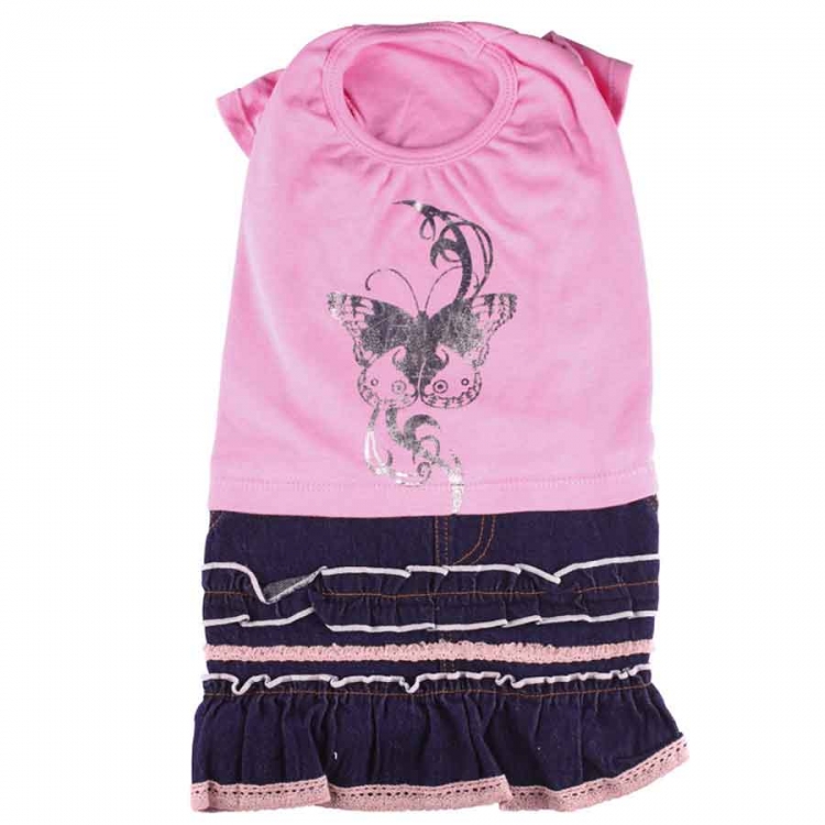 Dieses sommerliche Hundekleid von Doggydolly Hundemode hat einen dunkelblauen Jeansrock und ein pinkes Shirt mit Schmetterlingsaufdruck. Der Hunderock ist mit weißen Spitzenbordüren durchzogen. Das ärmellose Hundeshirt ist knallig pink und hat einen silberfarbenen Schmetterlingsaufdruck als besonderen Blickfang auf dem Rücken.