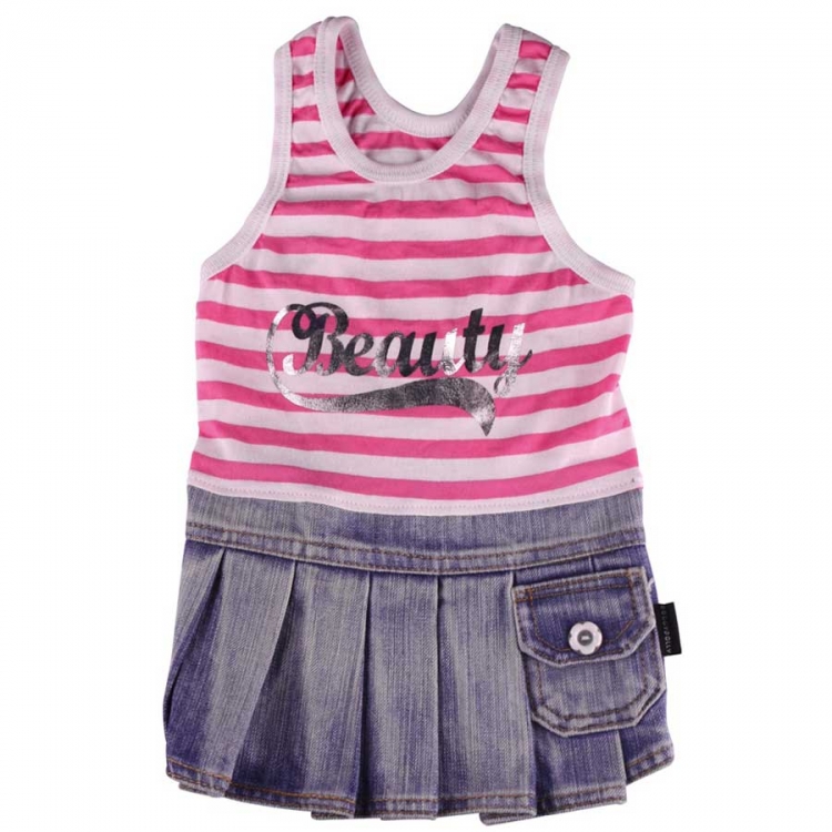 Mit diesem rosa-gestreiften Jeanskleid von Doggydolly Hundebekleidung kann der Sommer kommen. Das Hundekleid besteht aus einem rosa-weiß gestreiften Tanktop und einem Faltenrock aus hellblauen Jeansstoff. Auf dem Tanktop ist das Wort Beauty in silberner Farbe aufgedruckt. Den Faltenrock verziert ein kleines Leckerlie-Täschchen auf der rechten Seite. Dieses Kleid ist auch in lila und blau erhältlich.