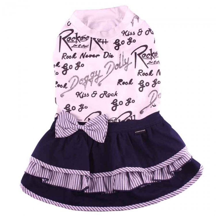 Hundekleid mit schwarzem Stoffrock und weißem Tanktop von Doggydolly Hundemode. Dieses Kleid ist genau das Richtige für die Rock'n'Roll-Fans unter den Hundedamen. Der Lagenrock ist aus zwei verschiedenen Stoffen: Abwechselnd eine Lage schwarz und eine Lage grau-weiß gestreift. An der linken Seite hat der Rock eine grau-weiß getstreifte Schleife. Das weiße Tanktop trägt verschiedene kleine Schriftzüge in schwarz und grau. Dieses Modell ist auch für den Rüden mit Stoffhose erhältlich.