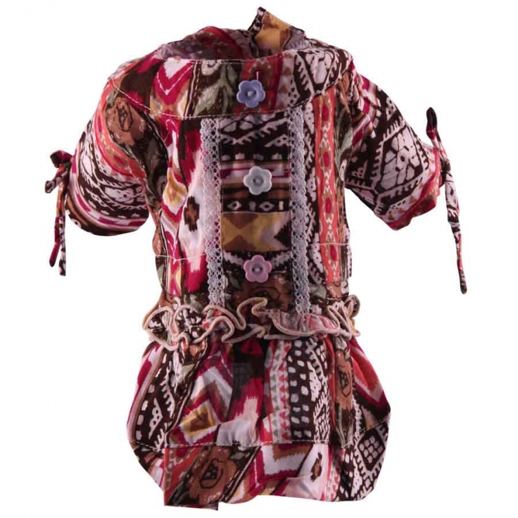 Dieses Kleid von Doggydolly Hundebekleidung hat ein Grafikmuster in hellen, sommerlichen Farben. An den Ärmeln befinden sich kleine Schleifchen, die das Kleidchen noch verschönern. Ein besonderer Blickfang sind die bunten Knöpfe in Blümchenform am Rücken des Hundekleides. Das Sommerkleid wird ganz einfach mit einem Klettverschluss am Bauch geschlossen, wodurch es sehr leicht an- und auszuziehen ist.