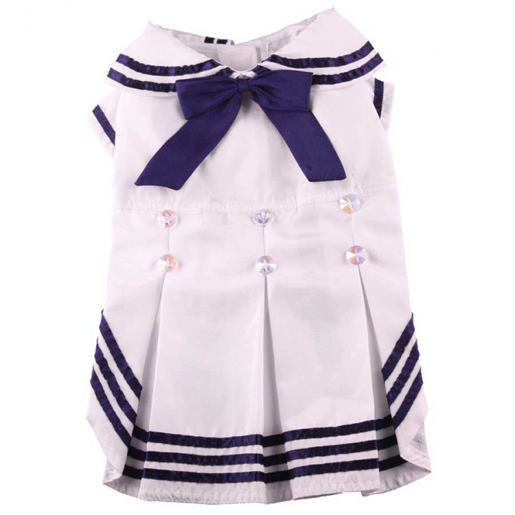 Dieses schicke Doggydolly Kleid für Hunde im Matrosen-Look in weiß darf auf Ihrer nächsten Schiffsreise nicht fehlen. Das Hundekleid hat einen Faltenrock und ist am oberen und unteren Teil blau-gestreift. Den Kragen des Matrosenkleides ziert ein blaues Schleifchen. Natürlich dürfen die Knöpfchen nicht fehlen, die wie bei einer echten Matrosenuniform in zwei Reihen angebracht sind. Dieses Kleid ist auch in dunkelblau erhältlich.