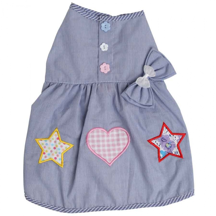 Dieses Kleid von Doggydolly Hundemode ist aus einem leichten grau-weißen Baumwollstoff. Das Hundekleid hat ein aufgenähtes rosa Herz und zwei aufgenähte Sterne auf dem Rock und Blümchenknöpfe am Oberteil. Die weiß-grau gestreifte Schleife an der rechten Seite peppt das schlichte Design zusätzlich auf.