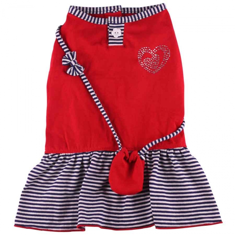 Das rote Kleid mit kleinem Täschchen von Doggydolly Hundebekleidung ist ideal für die Shoppingtour mit Frauchen. Das Hundekleid besteht aus einem roten Oberteil mit Strassherz und einem schwarz-weiß gestreiften, gerade geschnittenen Rock. Die rote Tasche trägt die Hundedame an einem schwarz-weißen Riemchen über die Schulter. Hier lassen sich auch Leckerlis verstauen - für den Fall dass das Bummeln mit Frauchen mal wieder länger dauert.