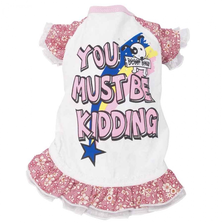 Dieses süße Shirtkleid von Doggydolly Hundebekleidung ist rosa-weiß und hat einen großen rosa Aufdruck auf dem Rücken, der die Worte You Must Be Kidding zeigt. Die Ärmelchen sowie der leicht gerüschte Saum des Hundekleids sind rosa mit weißem Blümchenmuster. Dieses Kleid gibt es auch in der Farbe blau.