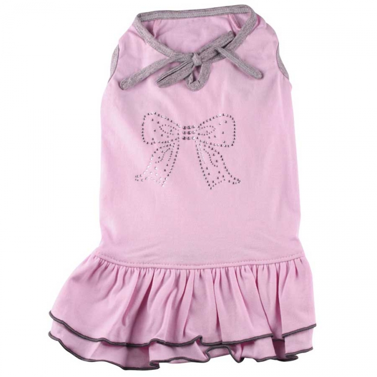 Dieses Kleid von Doggydolly Hundebekleidung ist ganz in rosa gehalten und hat ein Glitzer-Schleifchen auf dem Rücken. Der Saum des Hundekleides ist grau. Das Shirtkleid für Hunde ist aus elastischem Baumwollstoff, wodurch es angenehm zu tragen ist. Das Kleid besteht aus einem Tanktop mit Strassverzierung und einem zweilagigen, gerüschten Rock. Dieses Kleid ist auch in schwarz erhältlich.