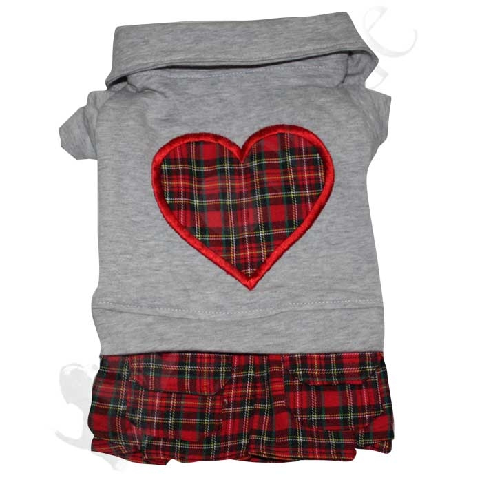 Genau das Richtige für süße Hundedamen: Das Hundekleid mit aufgenähtem Herz und Karomuster von Doggydolly Hundebekleidung ist perfekt für kühle Tage. Das sportliche Kleid hat zwei aufgenähte Taschen für Leckerlies auf der Rückseite und einen Polokragen. Das Oberteil ist grau und der Rock in schickem, rot-grünem Karomuster gehalten.
