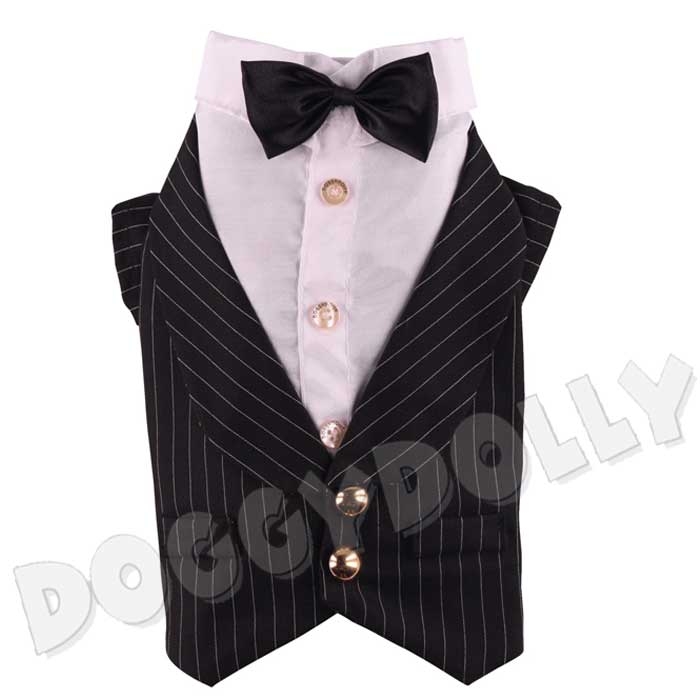 Der Frack mit Fliege für Mops und Bulldogge von Doggydolly Hundemode ist perfekt für feierliche Anlässe - auch für die Hundehochzeit. Mit diesem Outfit ist auch jeder Hunde als Gast bei einer Hochzeitsfeier willkommen. Der Hundefrack ist gestreift, hat 2 goldene Deko-Knöpfe am Bauch und ein weißes Hemd, das mit dem Sakko zusammengenäht ist. Das besondere Highlight ist die schwarze Fliege.