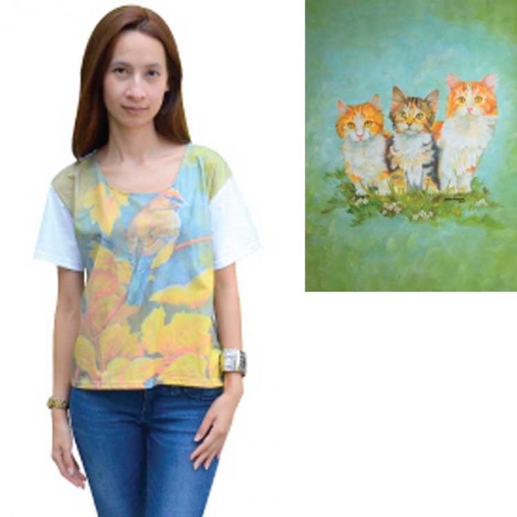 Das abgebildete Shirt mit dem Vogeldruck ist nur ein Modellbeispiel. Das Motiv dieses Shirt mit den Katzen sehen Sie rechts.