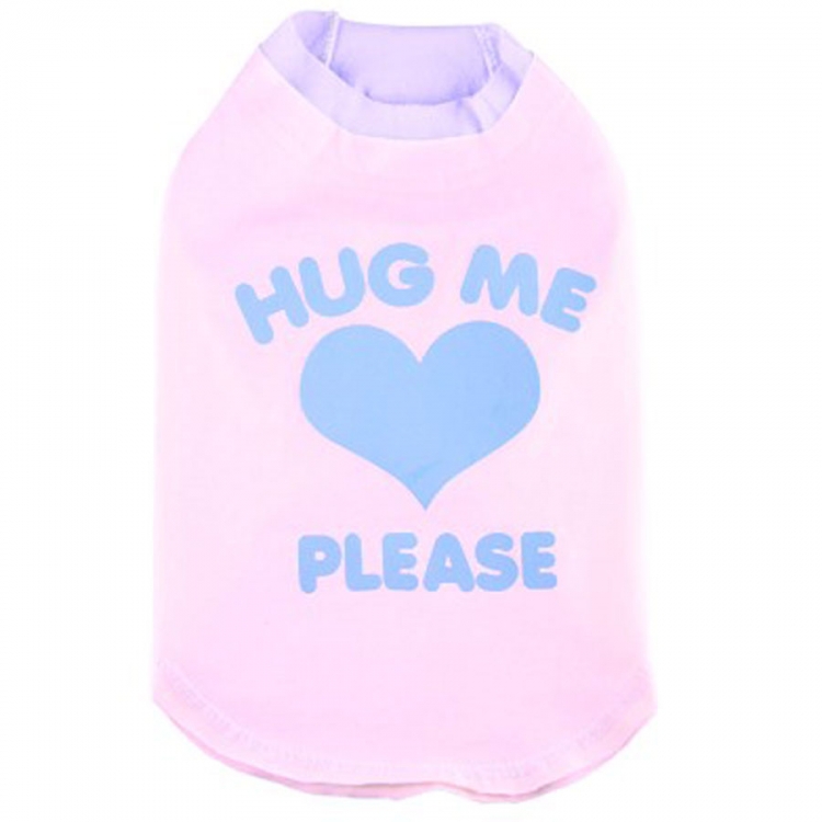 Süßes und doch schlichtes Hundshirt in den Farben beige und blau. Das ärmellose Hundeshirt ist cremefarben und hat ein großes blaues Herz und die Worte "Hug Me Please" in rosafarbener Schrift auf dem Rücken. Die Nähte des Hundeshirts sind blau.