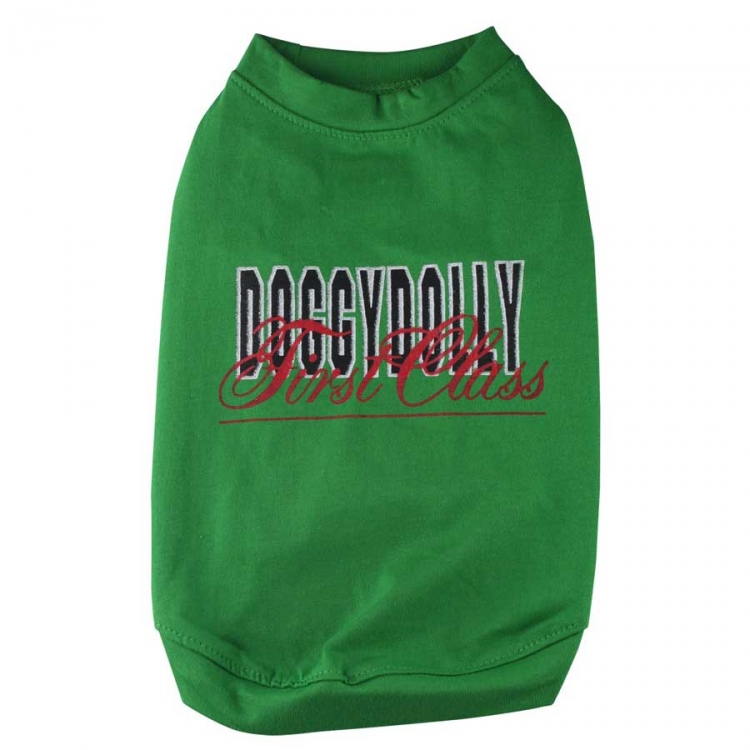 Bequemes Hundeshirt in der Farbe Grün vom Designerlabel Doggydolly Hundemode. Auf der Rückenpartie findet sich die Aufschrift "Doggydolly First Class" in schwarzer und roter Schrift.