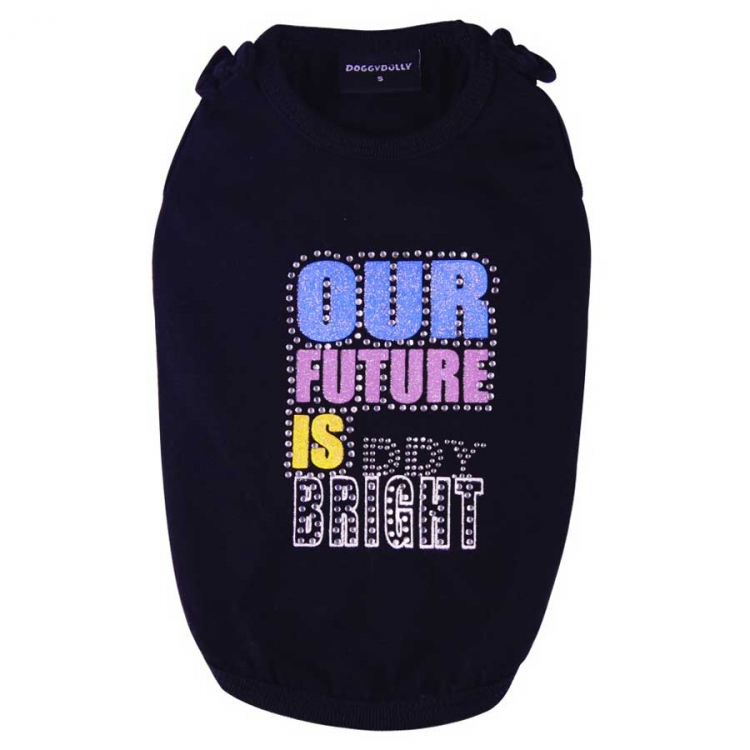 Süßes Hundshirt in schwarz mit Schleifchen und Schriftzug. Dieses T-Shirt für Hunde wurde speziell für Hundedamen designed. Es ist schwarz und hat einen großen, bunten Schriftzug "Our Future Is Bright" auf dem Rücken. Der Schriftzug wird durch Strasssteinchen hervorgehoben, die sich um ihn herum finden. Das ärmellose Hundeshirt hat als kleines Detail noch je ein Schleifchen seitlich des Kragens.