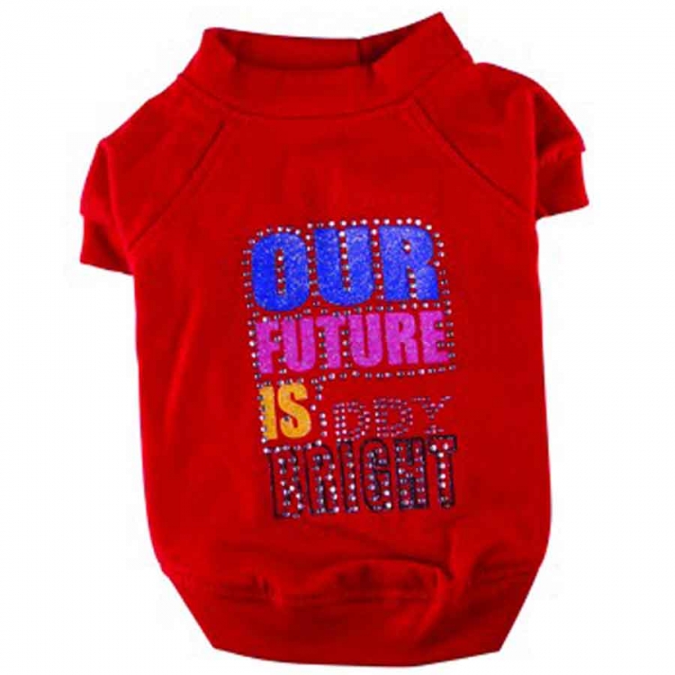 Schickes Hundeshirt in rot mit farbigem Aufdruck und Strasssteinen auf dem Rücken. Dieses Hundeshirt ist etwas für Hunde, die gerne im Mittelpunkt stehen und Aufmerksamkeit geniessen. Das T-Shirt für Hunde ist rot und hat einen großen, bunten Aufdruck auf dem Rücken, der die Worte "Our Future Is Bright" zeigt. Der Aufdruck wird zusätzlich noch von Strasssteinen umrandet.