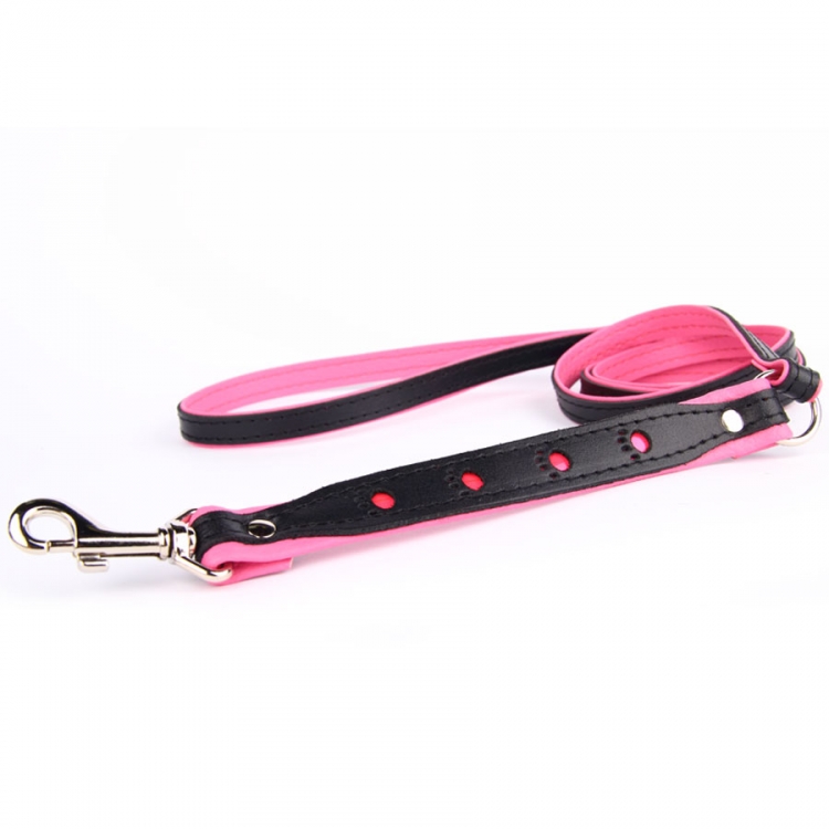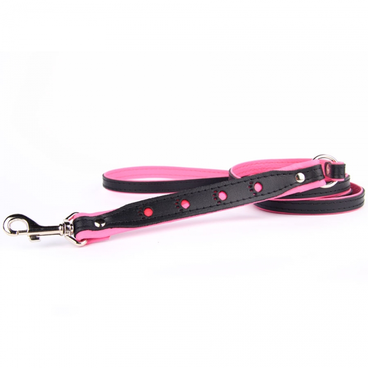 Leather dog leash reflector paw BLACK'n PINK 130x1,6