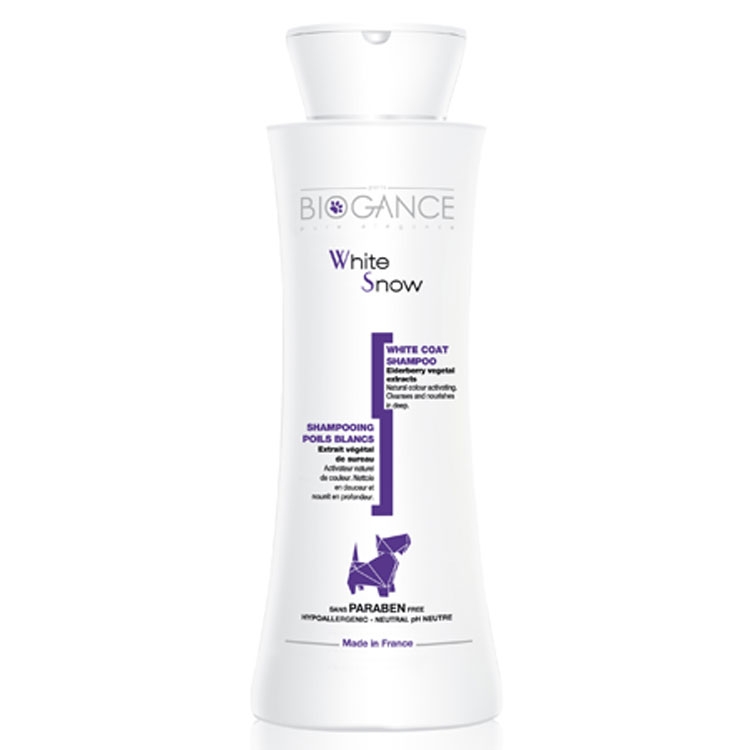 White Snow is a neutral pH and paraben free shampoo. It has been formulated with 98% natural & organic ingredients. Made with Elderberry, Cornflower and Aloe Vera to activate the coat's original color, moisturizes and prevent yellowing while bringing shine and radiance to the coat. Result: Coat left soft and shiny. Suitable for puppies and white or light-coloured cats. Directions for use: Apply to wet coat, gently rub then rinse thoroughly. Renew the application, and let stand for 2 minutes before rinsing out. Avoid contact with eyes. 250ml