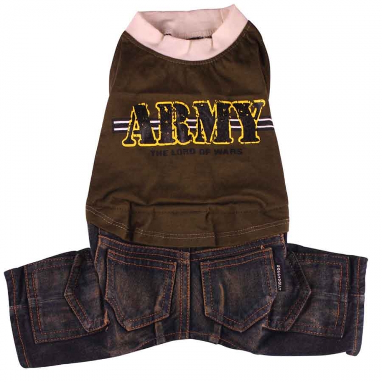 That khaki green army shirt with a jean pant is perfect for the adventurous dogs.