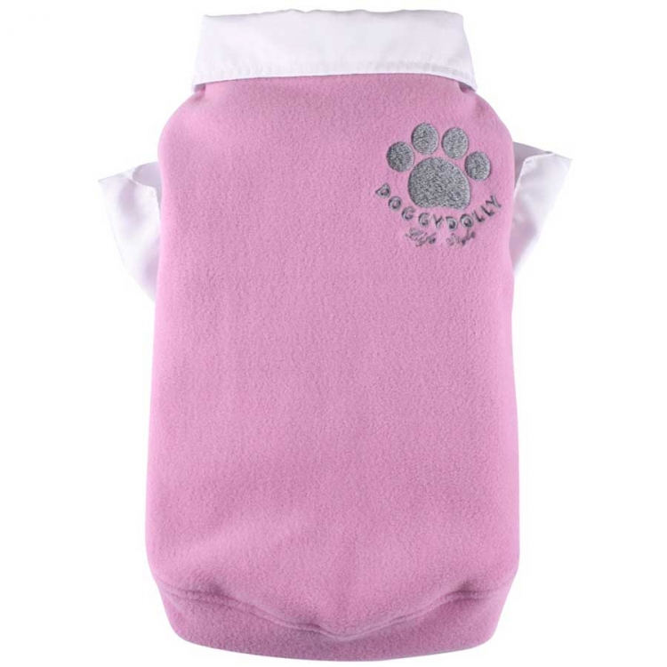 This high-class, warm slipover is the perfect clothing for the dinner at the restaurant during colder days. The blue fleece pullover for dogs with the white shirt sleeves and collar andthe embroidered paw makes your dog look very elegant. Details: pink fleece, white cotton shirt. Size XS chest 31-33cm, back 18-20cm