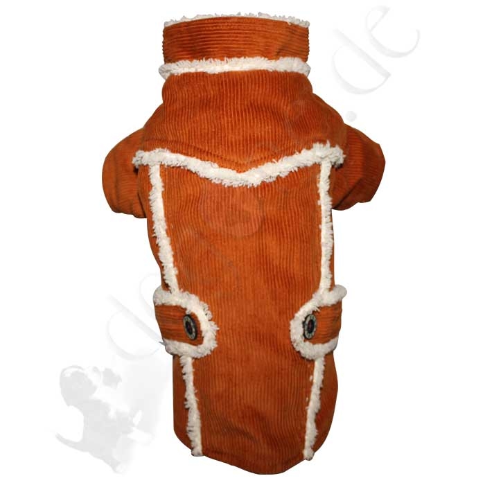 Brown corduroy jacket by Doggydolly dog fashion - perfect for cold winter days! The plain dog coat is costumised by fake fur borders. Due to its velcro strip it is very easy to wear. This dog jacket also exists in cream and dark red.