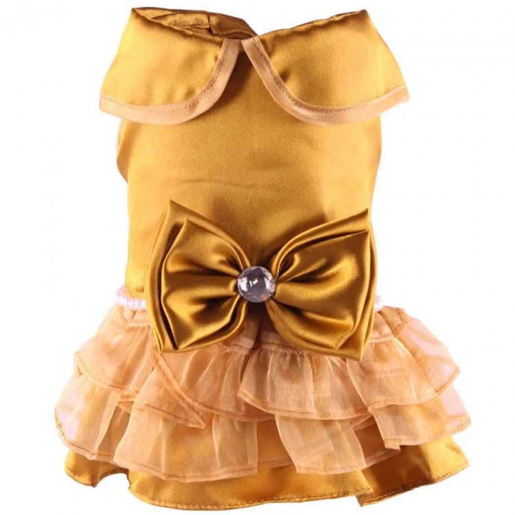 That gold dress with a collar is nice for evenings where only VIP are invited. Bow with a shiny stone and a perl necklace around the waist