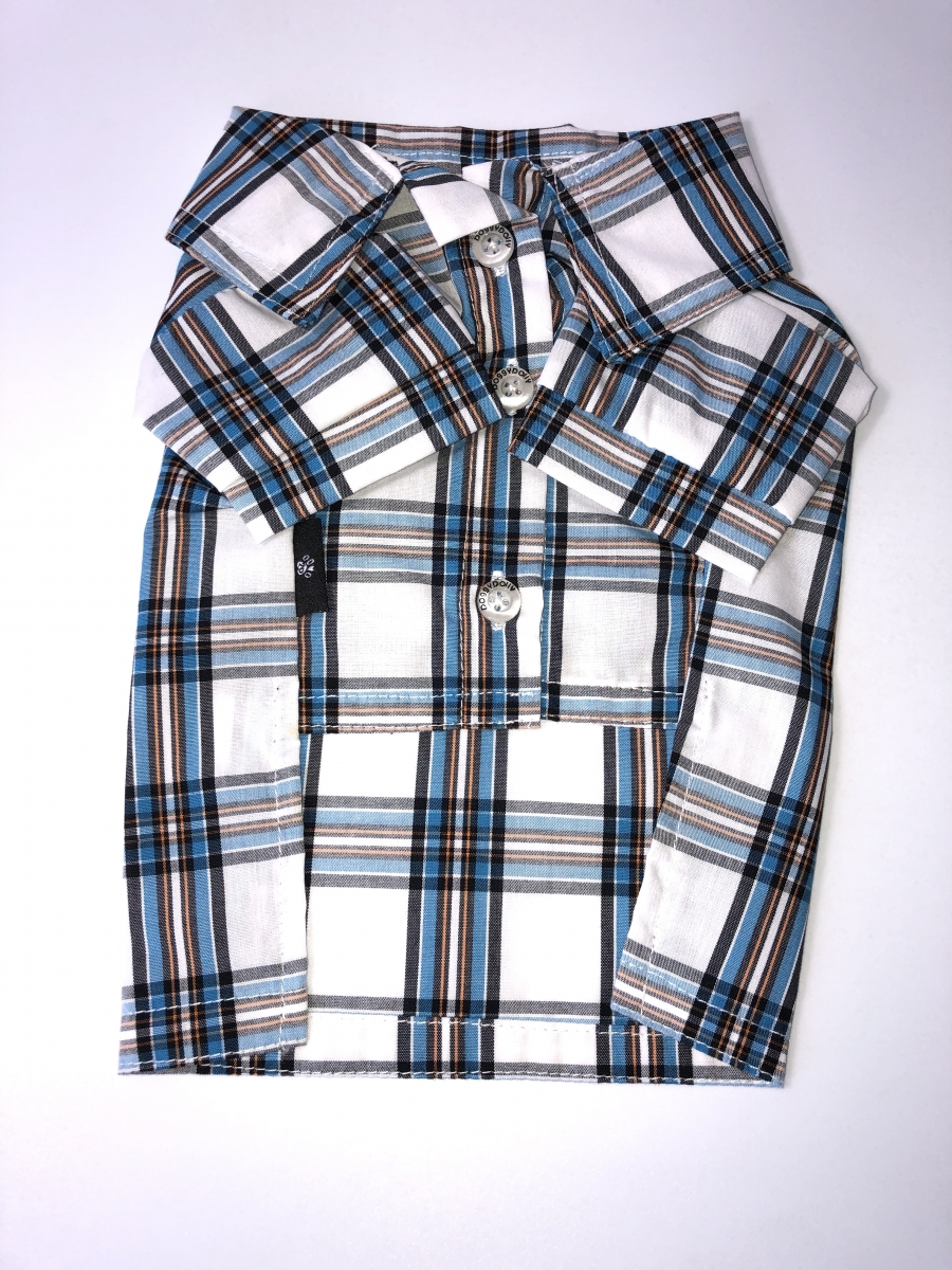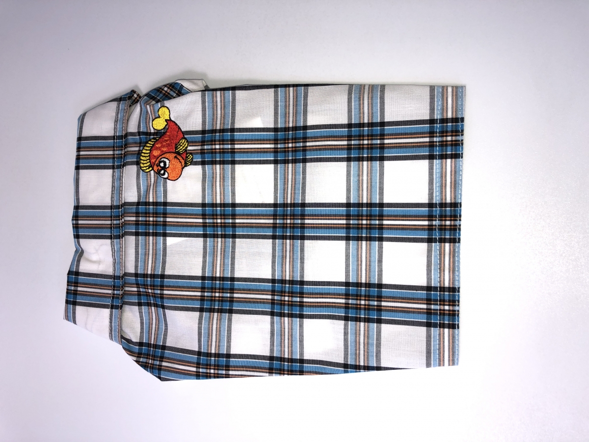 Light checked shirt for dogs with a cute fish application on the shoulder area. The dog shirt is closed under the belly with real shirt buttons. Delicate wash 30°. Size S chest 36-38cm, back 23-25cm