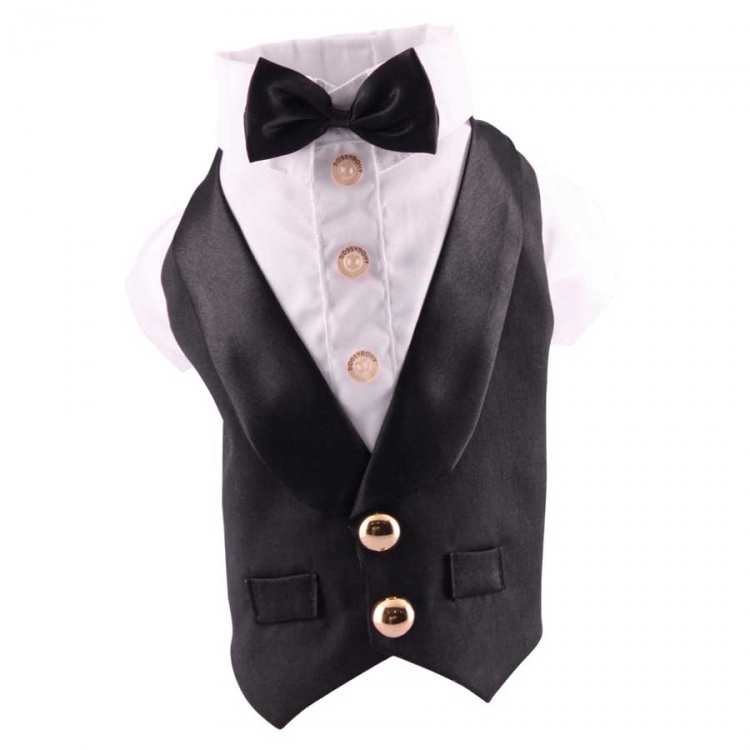 With this chic tuxedo, consisting in a white skirt, tie and bow tie, your dog will be the king of the night. Your dog will be thrilled by the attention, which he will cause with this tuxedo. In addition he will be dressed in a few minutes he will feel on top of the world. At this model, the dog wears the tuxedo on the back. Details: Black tuxedo with sewed white shirt and black bow tie Buttons in gold Velcro on the belly