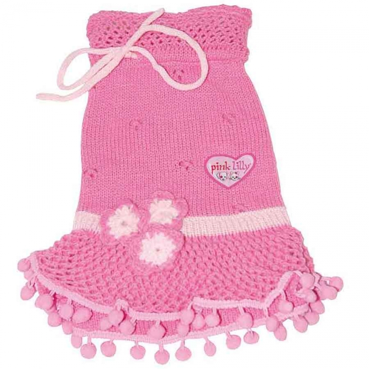 La robe canine Sweety de la série Pink Lilly par Vivog porte des broderies au col et au bas de la robe ainsi que des pompons de finition. Sur la ceinture de la robe pour chiens sont cousues trois fleurs brodées. La robe pour chiennes a un resserage pour le coup. 100% polyester. Taille: 35cm.